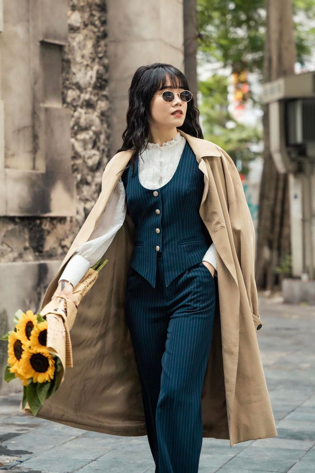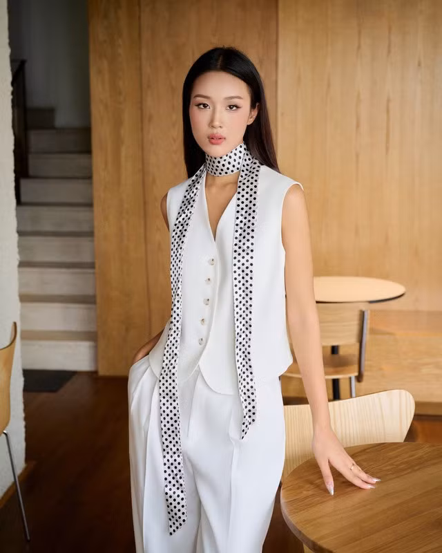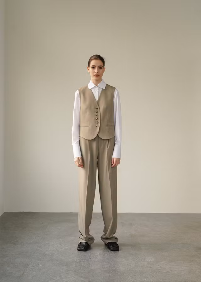 Áo gile vest có thể mặc theo set cả bộ đồng điệu với quần dài để tạo hình ảnh chuyên nghiệp và thanh lịch. Một chiếc áo khoác dáng dài màu beige khoác hờ trên vai góp phần hoàn thiện hình ảnh một quý cô mạnh mẽ, xinh đẹp đầy uy quyền