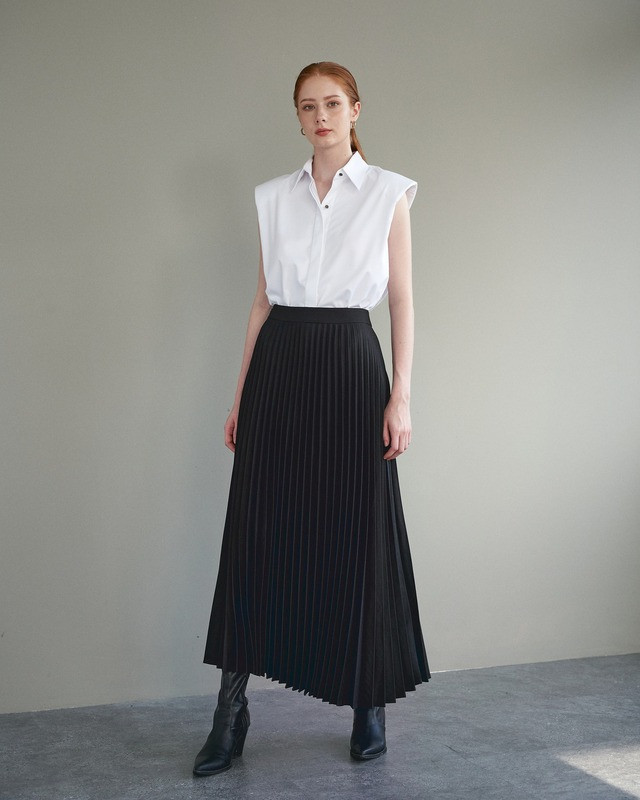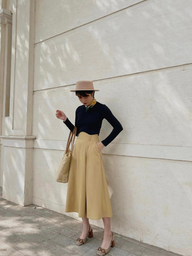 Phong cách thời trang đậm chất classic được chuyển tải bằng bộ cánh kết hợp áo sơ mi tay phồng, gile vest, chân váy xếp ly, giày cao gót và túi xách tay. Outfit có sự chuyển màu đầy mượt mà, chi tiết nhấn nhá vừa đủ gợi cảm giác hoài cổ lãng mạn nhưng cũng vô cùng thời thượng và hợp mốt