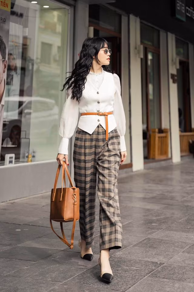 Nắm bắt tinh thần của thời trang vintage, nàng có thể tái hiện khí chất thanh lịch đặc trưng qua việc lựa chọn những màu sắc và họa tiết chủ đạo cho outfit. Gam màu cam đất, họa tiết ô vuông kẻ sọc đan xen, vest gile, sơ mi tay chít phồng và chiếc thắt lưng da bên ngoài áo vest cùng làm nổi bật hình ảnh nữ fashionista mùa đông