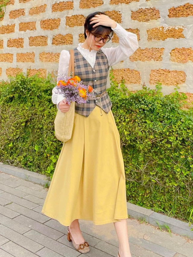 Vẫn là chiếc áo gile quen thuộc được làm mới bằng họa tiết kẻ. Item này khi được kết hợp cùng chân váy midi, túi tote đeo vai tạo nên hình ảnh trẻ trung, tự nhiên và gần gũi. Cách chưng diện này khá đơn giản nhưng lại phát huy hiệu quả tối đa nhờ không khí lạnh đặc trưng của những tháng cuối năm