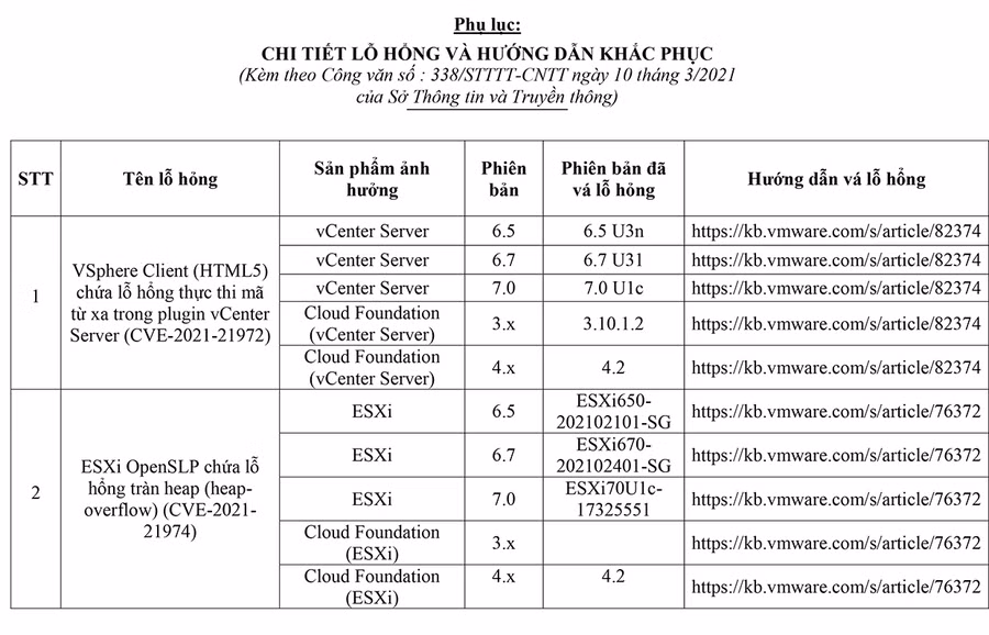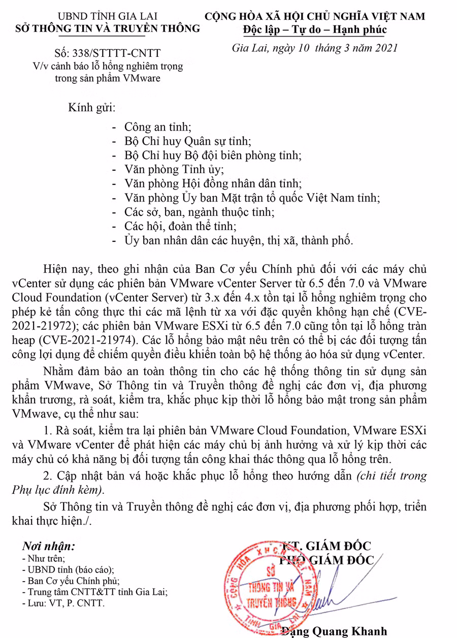 (GLO)- Ngày 10-3-2021, Sở Thông tin và Truyền thông Gia Lai có Công văn số 338/STTTT-CNTT về cảnh báo lỗ hổng nghiêm trọng trong sản phẩm VMware.