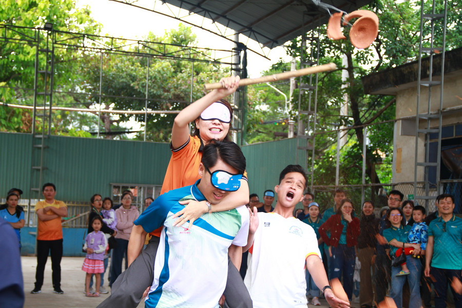 Phần thi bịt mắt đập niêu tạo những tiếng cười rộn ràng hơn cả. Các vận động viên bị bịt mắt, tay cầm gậy, dò dẫm bước về phía chiếc niêu treo lơ lửng. Với sự phối hợp nhịp nhàng, ăn ý, đội Câu lạc bộ các Báo Thường trú tỉnh Gia Lai đã xuất sắc đập trúng niêu trong thời gian ngắn nhất để giành giải nhất ở phần thi này.