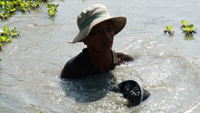 Đang lặn ngụp mò đất dưới mương, ông Trương Văn Bê (quê ở xã Vĩnh Bình, huyện Vĩnh Thạnh, TP Cần Thơ) ngước lên, đưa tay vuốt mặt: “Thấy cực khổ vậy chứ buông ra khô áo là hết tiền, đói ngay chú ơi!”. Chạm tuổi 60, với thâm niên 30 năm hành nghề, ông Bê là trưởng nhóm thợ lặn đất ở đây. Vườn chuối này chủ mới trồng khoảng 2 tháng, nhóm ông Bê được thuê lặn đất đắp gốc cho chuối phát triển. Nhóm bắt đầu nhận việc từ 1 tuần nay, dự kiến khoảng 25 tháng Chạp thì xong. Tiền công mỗi người nhận được từ 200-300 nghìn đồng mỗi ngày.