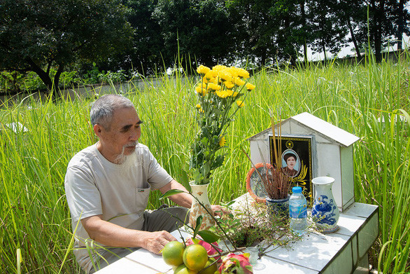 Ông Trần Văn Nhuận, em trai liệt sĩ Bắc, cắm những bông cúc vàng lên mộ, rồi đặt lại chiếc gương cho ngay ngắn. "Ngày xưa, tóc chị tôi đen dài lắm! Bố mẹ tôi từng bảo chị là người con gái đẹp nhất thôn Đoài".