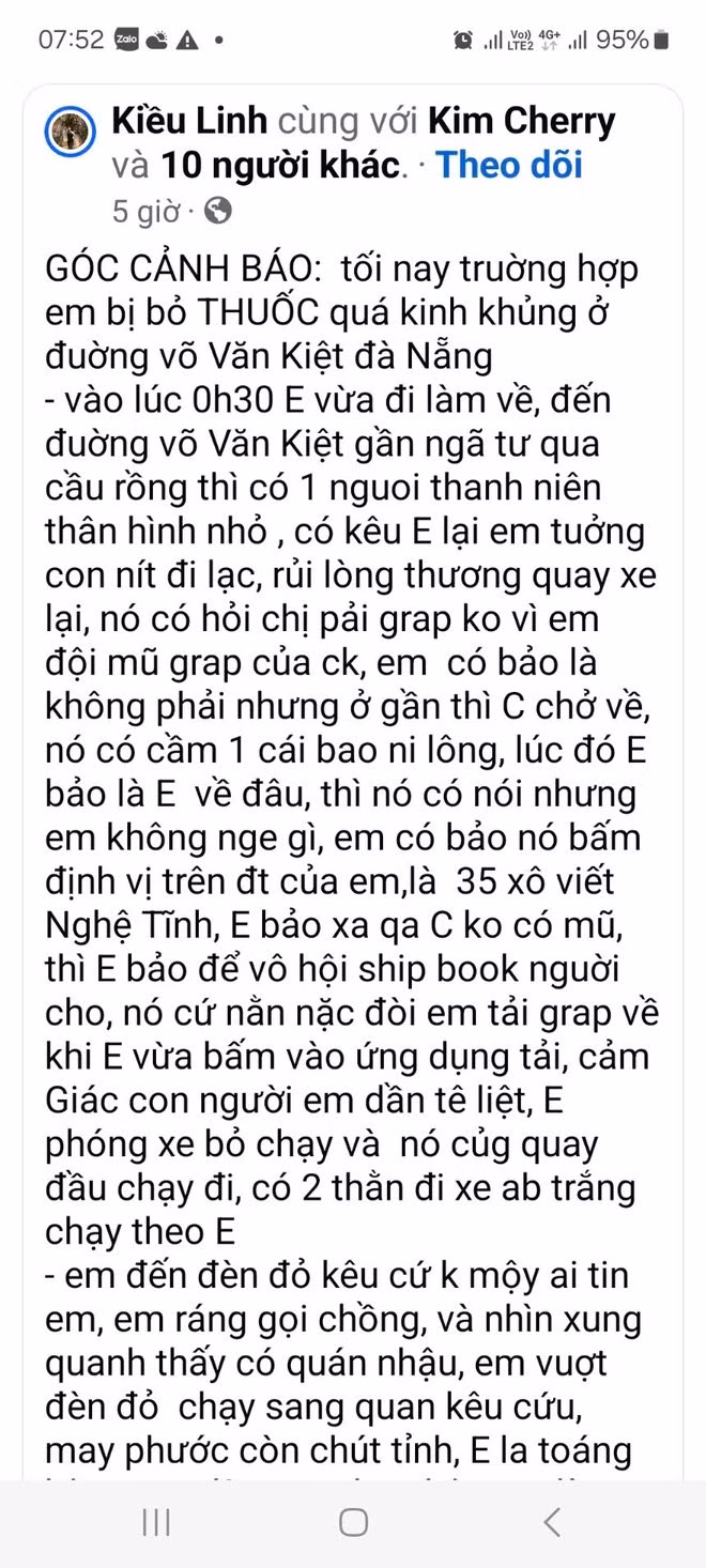 Cụ thể, nội dung bài đăng cho biết khoảng tối 16-2, chị L. bị một đối tượng lạ chuốc thuốc mê khi đang di chuyển trên đường Võ Văn Kiệt, quận Sơn Trà, TP Đà Nẵng. Nạn nhân kịp bỏ chạy vào một nhà hàng gần đó và được người dân đưa đi cấp cứu. Bên dưới bài đăng, người này còn đăng tải thêm một số hình ảnh chứng minh mình đang cấp cứu tại bệnh viện.