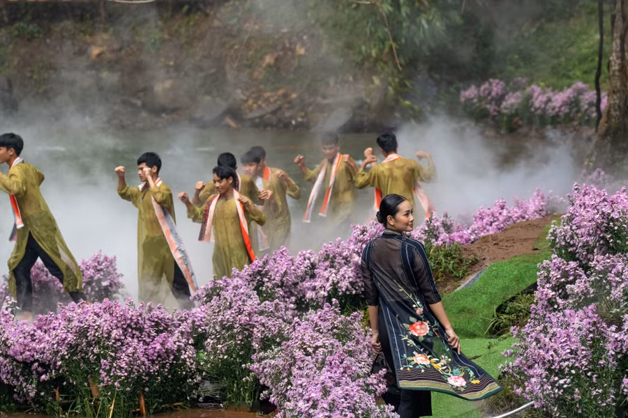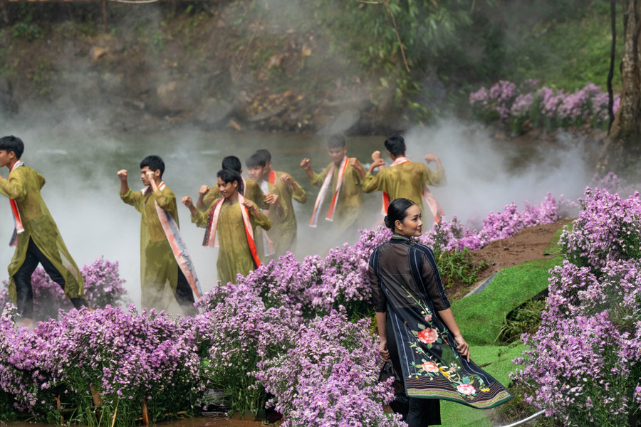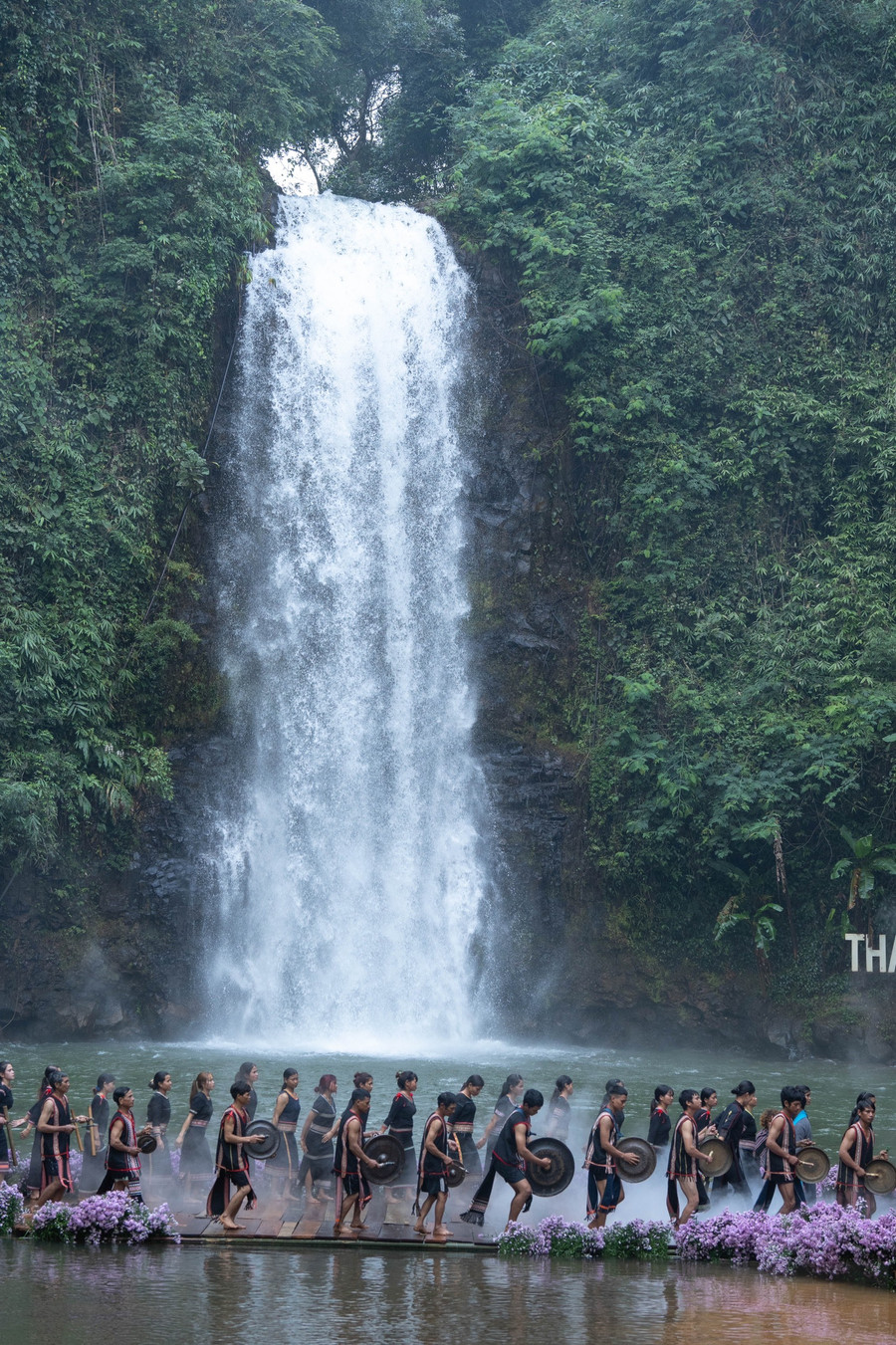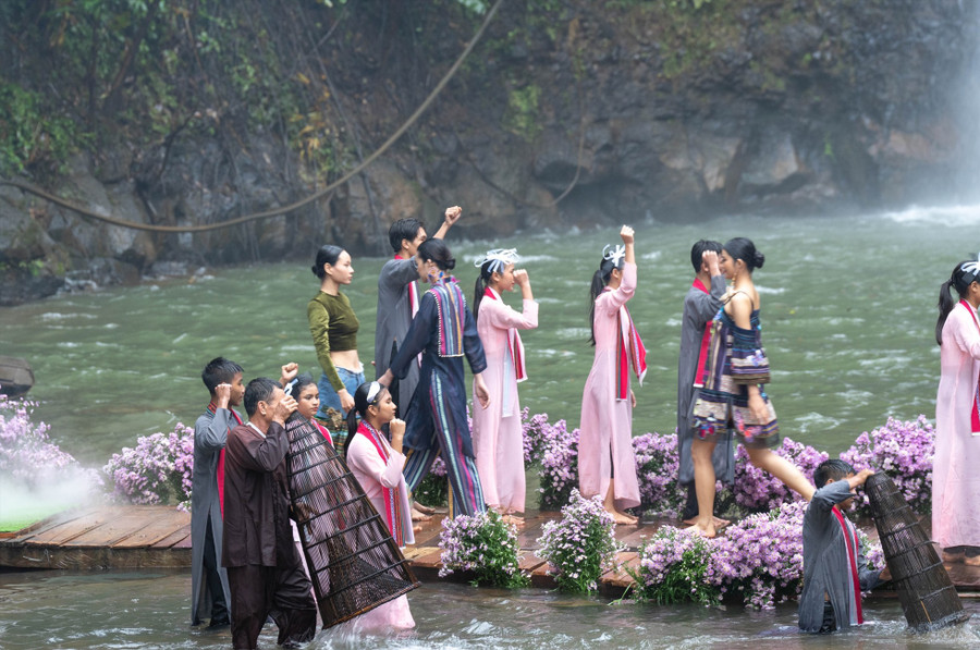 | Biểu diễn thời trang ngay lòng hồ ở dưới chân thác nước Pa Sỹ, Măng Đen, Kon Tum. Ảnh: Hà Nguyễn |