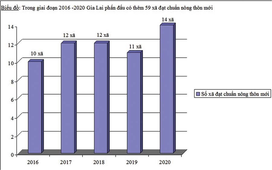 Trong giai đoạn 2011-2015, tỉnh Gia Lai đã huy động các nguồn lực thực hiện Chương trình mục tiêu quốc gia về xây dựng nông thôn mới đạt hơn 18.205 tỷ đồng. Trong giai đoạn 2016-2020, tỉnh phấn đấu có thêm 59 xã đạt chuẩn nông thôn mới; có 4 huyện, thị xã, thành phố hoàn thành chương trình xây dựng nông thôn mới là: Pleiku, An Khê, Ayun Pa và Đak Pơ. |