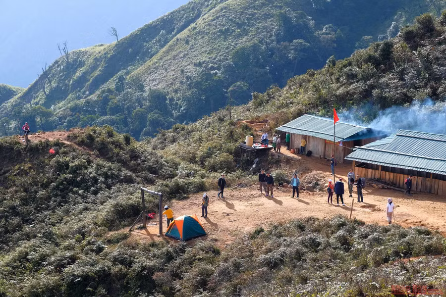 Sau khoảng 3-4 giờ leo liên tục vừa đi vừa nghỉ, chúng tôi cũng đã lên đến điểm trại 2.400m so với mực nước biển. Trước kia, ở đây chỉ là một bãi đất trống, các đoàn leo núi lên đến đây phải tự mang theo lều trại để cắm, nước sinh hoạt cũng phải vác từ dưới núi lên. Sau này nhận thấy lượng khách leo núi Tà Chì Nhù càng ngày càng cao, anh em porter người Mông đã đồng lòng dựng lên một căn lán trại bằng gỗ, sức chứa 100 người, dẫn nước suối về sinh hoạt, có đủ chăn đệm, có nhà bếp nấu nướng, khu vệ sinh, với giá 100.000đ/người/đêm.