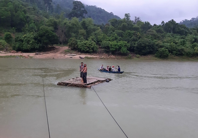 Tôi theo chân thầy Lê Huy Phương, Hiệu trưởng Trường Phổ thông Dân tộc bán trú Tiểu học Trà Tập (xã Trà Tập) tiến lại gần con sông ấy. Từ bên bờ bên kia, 2 người đàn ông dùng sức gắng kéo chiếc bè từ những thanh tre và gỗ ghép lại sang sông. Thầy Phương cho biết, đó là 2 người thợ đang thi công xây dựng ngôi trường mới cho người dân tái định cư ở làng Tắc Rối bên kia bờ, họ sang giúp thầy kéo bè đưa chúng tôi sang sông.