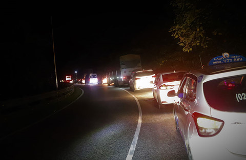Đến 19 giờ 45 phút cùng ngày (30.12), đèo Bảo Lộc đã lưu thông trở lại nhưng xe cộ di chuyển khó khăn. ẢNH: TRÙNG DƯƠNG