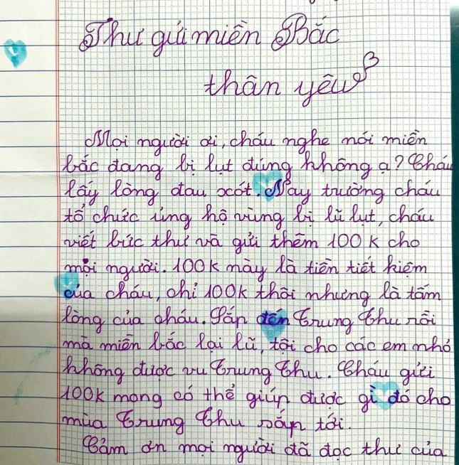 Mọi người ơi, cháu nghe nói miền Bắc đang bị lụt đúng không ạ? Cháu lấy lòng đau xót. Nay trường cháu tổ chức ủng hộ vùng bị lũ lụt, cháu viết bức thư và gửi thêm 100k cho mọi người. 100k này là tiền tiết kiệm của cháu, chỉ 100k thôi nhưng là tấm lòng của cháu. Sắp đến Trung thu rồi mà miền Bắc lại lũ, tội cho các em nhỏ không được vui Trung thu. Cháu gửi 100k mong có thể giúp được gì đó cho mùa Trung Thu sắp tới.