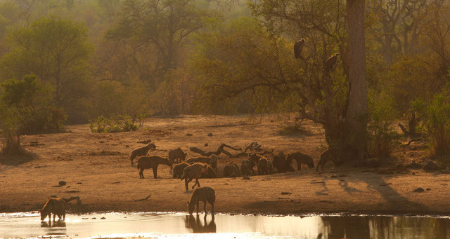 Các vườn quốc gia ở châu Phi thường đưa du khách tới thăm thú vào thời điểm bình minh bởi đó là khoảng thời gian tốt nhất trong ngày ngắm nhìn cuộc sống động vật hoang dã. Trong hình là cảnh hừng đông ở Tanda Tula thuộc vườn quốc gia Kruger.