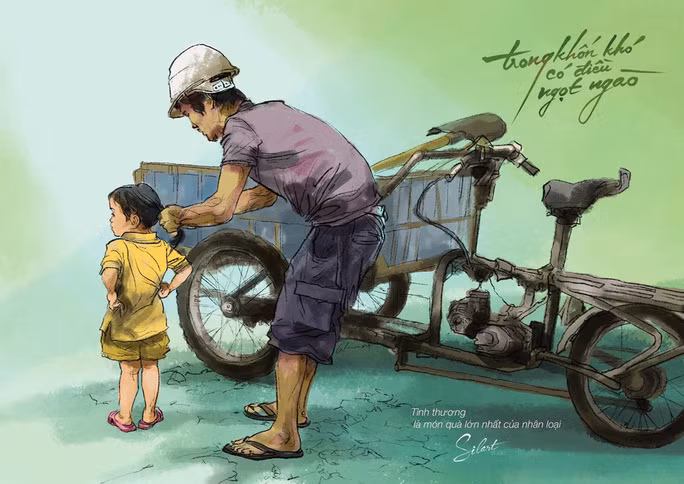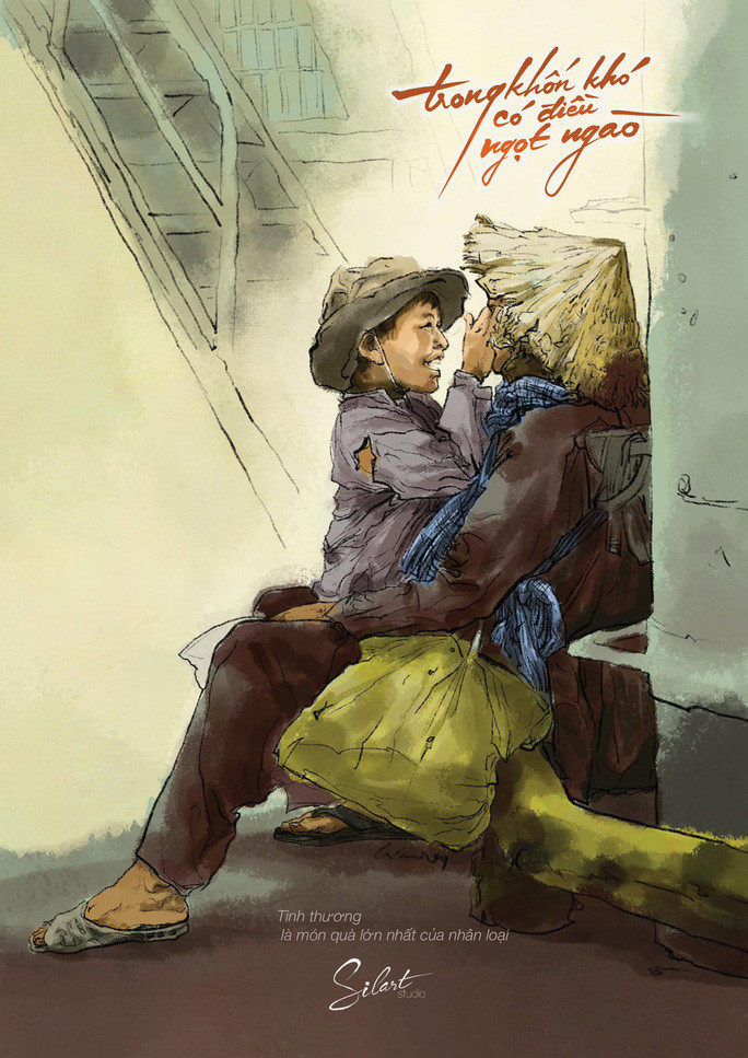 Hình ảnh khu chợ 0 đồng, bình trà đá miễn phí đặt bên vệ đường, chiếc bàn chất đầy hộp cơm mời người đi đường "ai cần cứ lấy", rồi "trạm cứu hộ" giúp sửa chữa xe máy ngập nước cho bà con miễn phí... trong tranh của Trần Trung Lĩnh cho thấy TP HCM dù đang căng mình chống chọi đại dịch nhưng vẫn luôn dạt dào yêu thương và đầy cảm xúc.