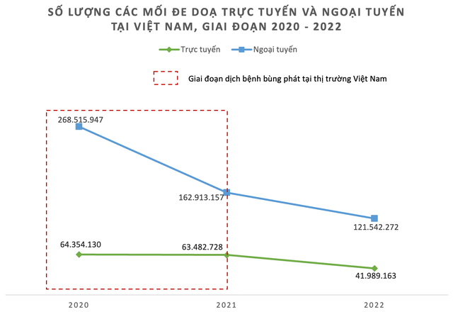 Đáng chú ý, số vụ tấn công tại Việt Nam năm 2022 cũng đã giảm 25,39% so với năm 2021 và giảm tới 54,74% so với năm 2020, với tổng số 121.542.272 mối đe dọa liên quan đến phần mềm độc hại phát tán qua USB, CD, DVD và các phương thức ngoại tuyến khác. Trong năm 2022, Việt Nam ở vị trí thứ 31 trên toàn thế giới về các mối đe dọa ngoại tuyến.
