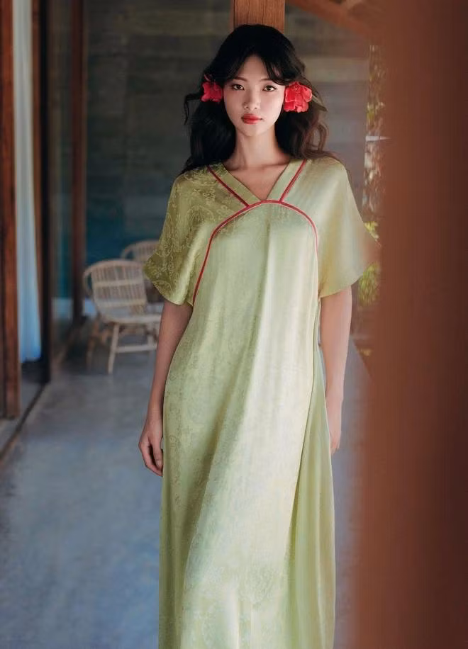 Vẻ đẹp sang trọng, yêu kiều đến từ các thiết kế maxi, midi làm từ chất liệu tơ lụa, gấm và taffeta mịn mướt kết hợp họa tiết độc bản được dệt và in chuyển nhiệt. Vẻ ngoài mỏng nhẹ, mềm mại, giàu tính ứng dụng và không quá "đỏng đảnh" từ các loại vải này giúp quý cô mặc đẹp vừa tiện sử dụng vừa dễ dàng chăm sóc.