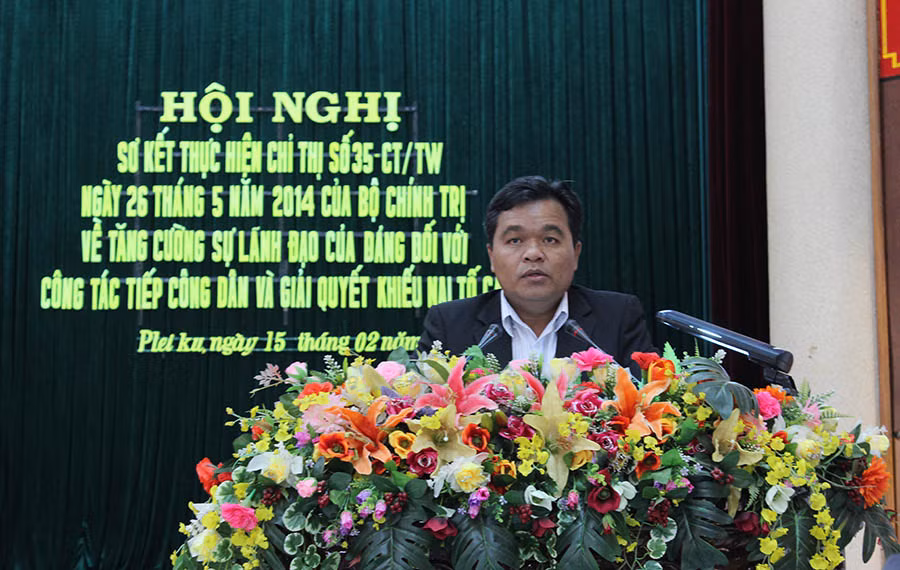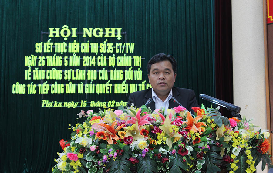 (GLO)- Sáng 15-2, tại Hội trường 2-9 (TP. Pleiku), Tỉnh ủy đã tổ chức Hội nghị sơ kết thực hiện Chỉ thị số 35-CT/TW ngày 26-5-2014 của Bộ Chính trị về tăng cường sự lãnh đạo của Đảng đối với công tác tiếp công dân và giải quyết khiếu nại, tố cáo. Các đồng chí: Dương Văn Trang-Ủy viên Ban Chấp hành Trung ương Đảng, Bí thư Tỉnh ủy, Chủ tịch HĐND tỉnh; Hồ Văn Niên-Ủy viên dự khuyết Ban Chấp hành Trung ương Đảng, Phó Bí thư Thường trực Tỉnh ủy, Trưởng đoàn đại biểu Quốc hội tỉnh; Võ Ngọc Thành-Phó Bí thư Tỉnh ủy, Chủ tịch UBND tỉnh đồng chủ trì hội nghị. Tham dự hội nghị còn có các đồng chí lãnh đạo HĐND, UBND, Ủy ban MTTQ Việt Nam tỉnh, các ban Đảng Tỉnh ủy và Bí thư, Chủ tịch, Chánh Thanh tra các huyện, thị xã, thành phố.