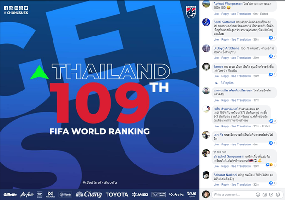 Sau khi bảng xếp hạng được công bố, fanpage của tuyển Thái Lan đăng ảnh kèm thông báo về vị trí của bóng đá Thái Lan. Bài đăng này nhận hơn 3.000 lượt like và gần 150 lượt bình luận chỉ trong chưa đầy 1 tiếng.