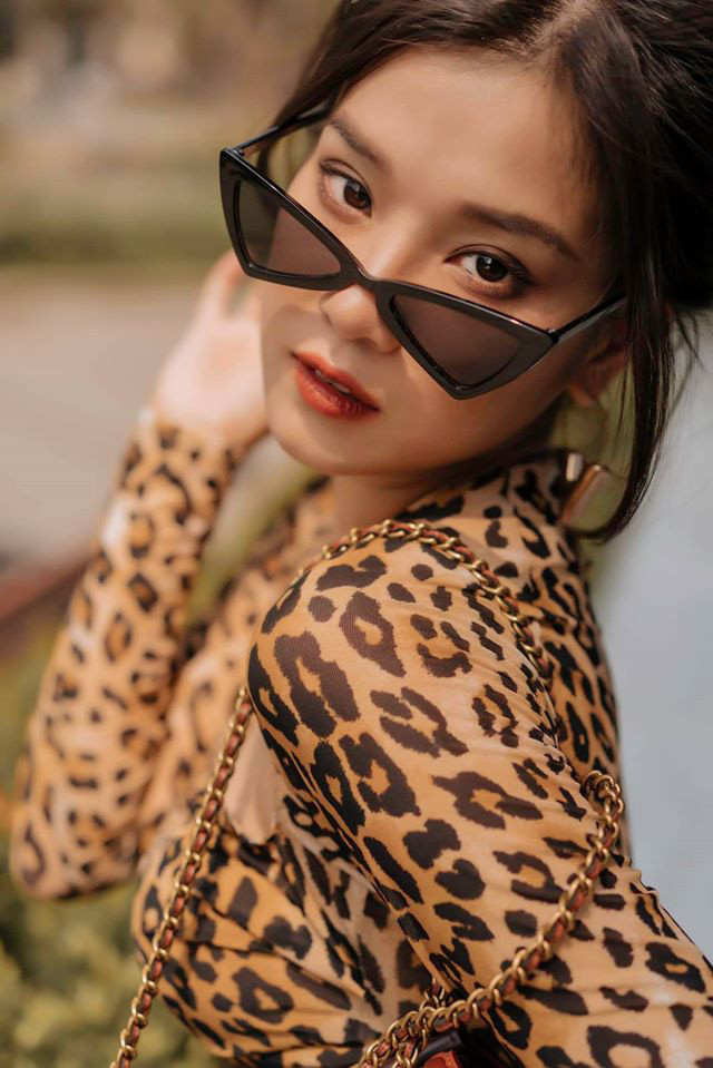 | Hoàng Yến Chibi diện trang phục họa tiết da báo kết hợp với chiếc kính sành điệu trong ngày. |