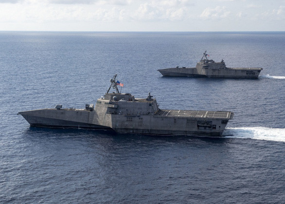 Tàu chiến đấu ven bờ USS Gabrielle Giffords (bên dưới) và USS Montgomery di chuyển trên Biển Đông ngày 28-1 - Ảnh: US NAVY