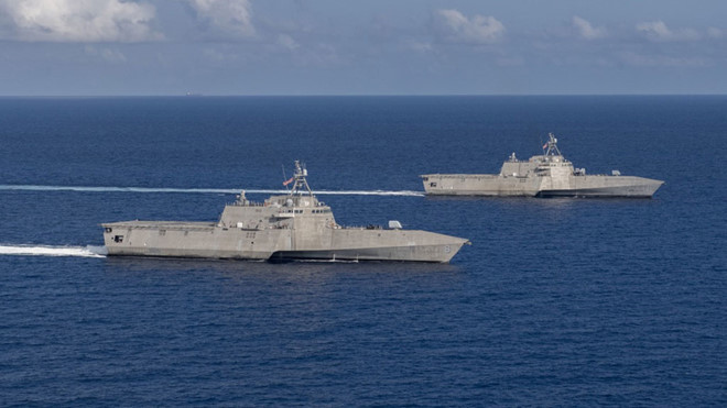 Cụ thể, các chuyên trang quân sự Mỹ và tờ Times of San Diego vừa dẫn nguồn từ quân đội Mỹ công bố hình ảnh chụp cảnh 2 tàu chiến cận bờ thuộc lớp Independence của nước này là USS Montgomery và USS Gabrielle Giffords song hành trên Biển Đông vào ngày 28.1.