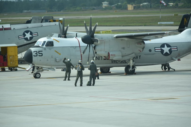 Máy bay C2A của hải quân Mỹ tại sân bay Đà Nẵng sáng 4.3. Ảnh: Đậu Tiến Đạt