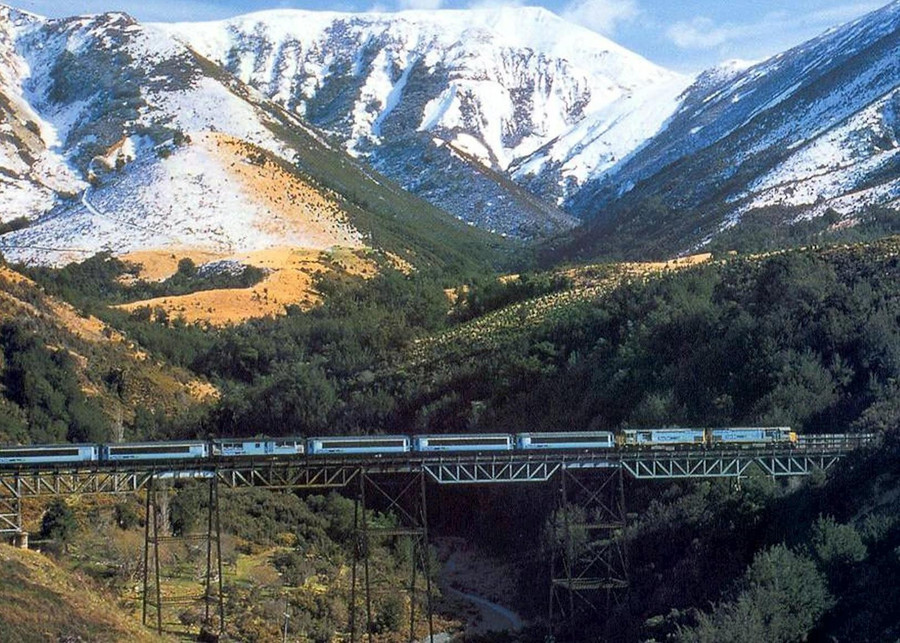 Con tàu có hàng ghế đầu để chiêm ngưỡng một số cảnh quan ấn tượng nhất của New Zealand, với những đồng bằng trải dài nhường chỗ cho những hẻm núi, dòng sông băng và dãy Alps phía Nam phủ đầy tuyết.