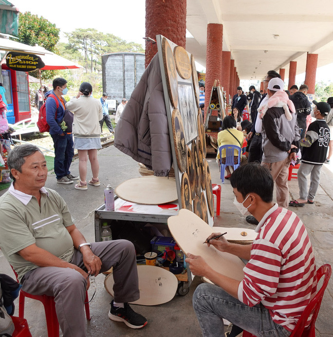 Sáng mùng 4 Tết (4-2), Ga Đà Lạt rất đông du khách. Nắng đẹp, trời lành lạnh nên mọi người cứ nấn ná hết chụp ảnh đến xếp hàng cho họa sĩ vẽ chân dung trên mặt gỗ chỉ trong 10 phút hay mua hoa, quà lưu niệm…