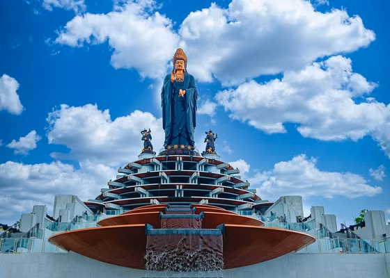 Nhìn từ trên cao, tượng Phật Bà đứng vững chãi, an lạc giữa bốn bức tượng Tứ Đại Thiên Vương bằng đồng với vẻ ngoài uy vũ, ngự trên một đài tháp được xếp bằng những đĩa nước khổng lồ. Từ cao vợi đó, các thác nước đổ xuống chảy tràn về 5 đĩa nước tượng trưng cho Ngũ hành tương sinh, cũng là hình ảnh cách điệu của hoa sen.