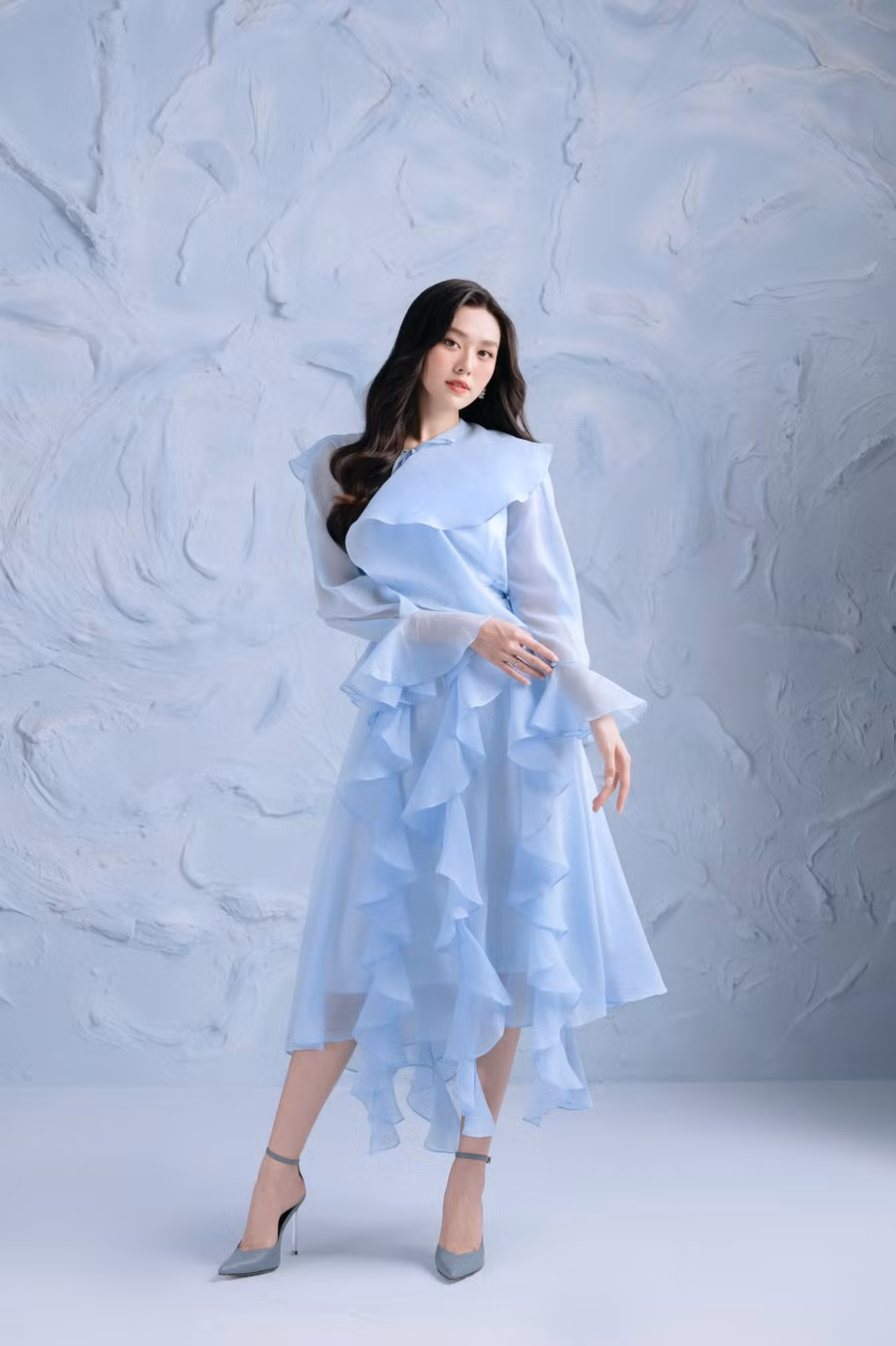 Lấy cảm hứng từ chuyến du hành nên thơ của gió, từng sắc độ góp mặt trong BST lại toát lên một nét cuốn hút thật xa vời - khi làn hơi mỏng manh thổi qua đại dương vô tận, chạm khẽ vào những cánh đồng hoa lấp lánh bạt ngàn. Sự hòa quyện sắc màu được đan xen hài hòa mà kín đáo, phảng phất hơi thở miên viễn mơ màng qua trùng trùng lớp lớp không gian.