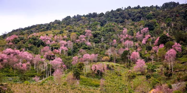 Đào núi Lang Biang chính là rừng hoa mai anh đào nối tiếng giữa rừng thông phía sau núi LangBiang. Gọi là “sau” – bởi phần núi này ngược hướng núi có thể nhìn thấy từ thành phố Đà Lạt và buổi chiều mới đón nắng mặt trời, đang rất thu hút du khách vì vào mùa mai anh đào nở rộ.