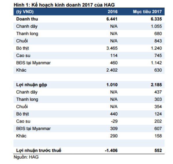 Theo Nghị quyết của HĐQT vừa được HAGL công bố hôm 21-6-2017, HAGL tham gia vào dự án trồng cây ăn trái từ đầu năm 2016 và bắt đầu có nguồn thu vào cuối năm 2016. Để giúp công ty vượt khó khăn với mục tiêu lấy ngắn nuôi dài, công ty tận dụng quỹ đất dôi dư tại Việt Nam, Lào, và Campuchia để trồng các loại cây ăn trái. Theo kế hoạch năm 2017, mảng minh doanh cây ăn trái đóng góp rất lớn vào cơ cấu doanh thu của công ty năm 2017. Cụ thể như sau: