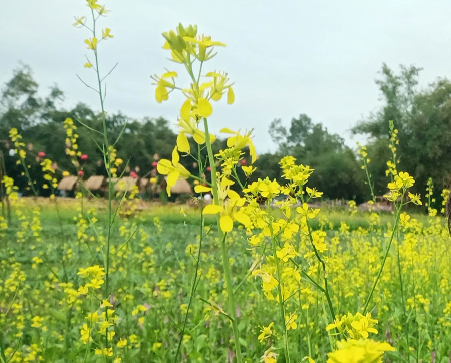 Đồng bãi tươi non các loại hoa dại đủ sắc, trinh nữ tim tím mỏng manh, xuyến chi khẽ rung nhẹ theo làn gió thoảng. Giọt sương mai còn đọng trên lá, chú dế đánh thức tiếng gáy bài ca xuân tràn.
