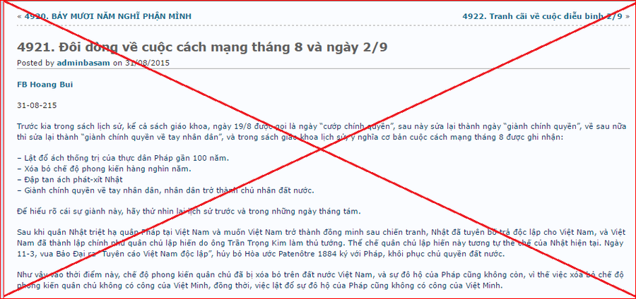 Đáng chú ý trên một số trang facebook phản động như “Tập hợp Dân Chủ đa nguyên” còn đưa bài viết của Nguyễn Gia Kiểng xuyên tạc rằng, Cách mạng tháng Tám 1945 là một “cuộc nội chiến cộng sản”. Họ đưa ra những câu hỏi kiểu: Cách mạng Tháng Tám có cần thiết và vinh quang thực không?...  Họ cho rằng: “Đảng Cộng sản Việt Nam đã hứng được quả ngọt trời cho là tình thế của Pháp, Nhật và hào khí của dân tộc lúc đó để cướp chính quyền cho riêng mình”. Hơn thế, họ còn ngụy biện: “Thay vì bước vào kỷ nguyên độc lập và dân chủ và bây giờ có thể đã là một nước giầu mạnh, chúng ta đã chỉ bắt đầu cùng với Cách mạng Tháng Tám một giai đoạn nội chiến rồi cộng sản với thực trạng bi đát hiện nay. Chúng ta đang là một quốc gia không đáng kể”....