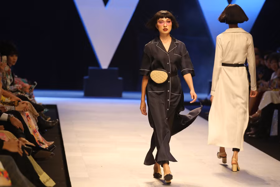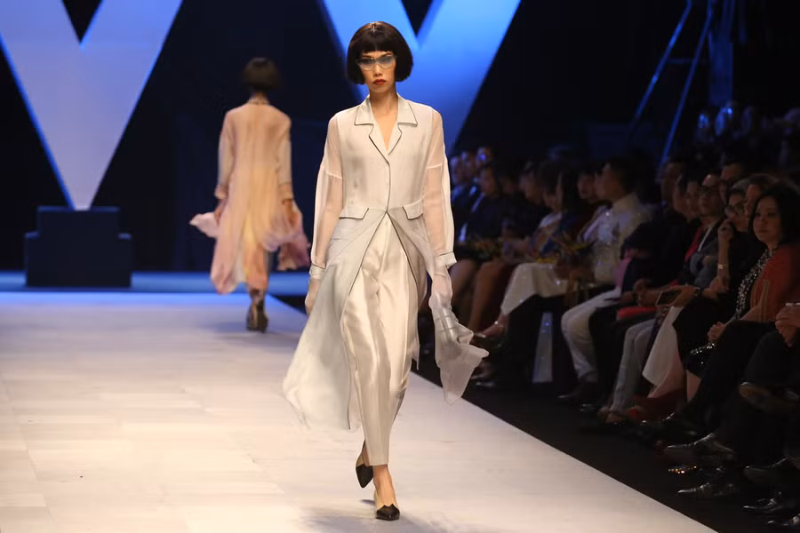 Tổng thể bộ sưu tập là thiết kế áo dài với đường nét phóng khoáng cùng gam màu trung tính như be, nâu thẫm, xám nhạt, xanh thủy thủ…