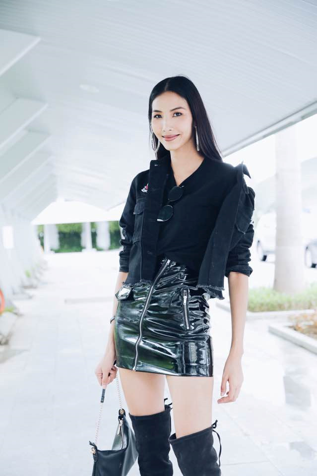 Hoàng Thùy mang đến hình ảnh cá tính với áo thun đơn giản kết hợp cùng chân váy da và tạo nét nổi bật bằng đôi boots cao cổ gợi cảm.