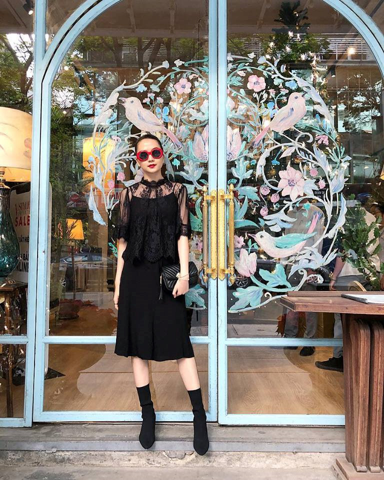 Nữ ca sĩ Thiều Bảo Trang diện set đồ đen phối ren tinh tế. Cô biết cách làm nổi bật bản thân khi kết hợp thêm cặp kính mắt ruồi gam màu đỏ sành điệu.