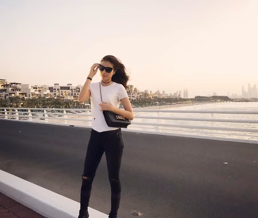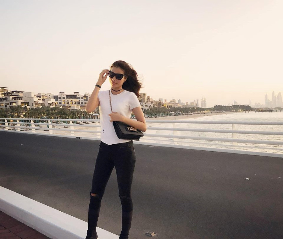 Phạm Hương đơn giản hơn với set đồ gồm áo thun, quần jeans rách cùng chiếc túi xách J'adior gam đen.
