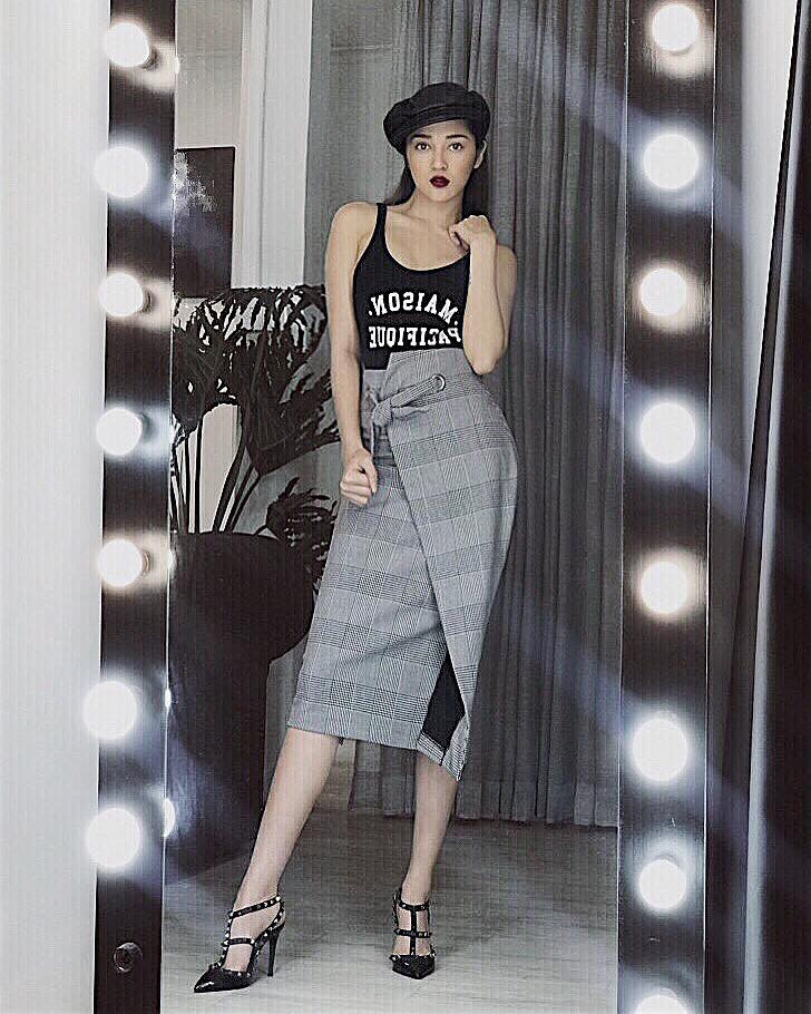 Bảo Anh cũng lựa chọn trang phục tông màu đen xám trung tính. Cô mang đến hình ảnh gợi cảm khi kết hợp váy kẻ ô cùng áo tank top in slogan sành điệu.