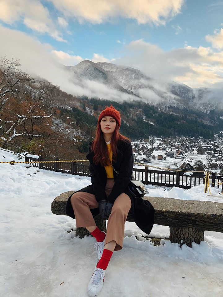 Du lịch Nhật Bản, Sĩ Thanh ấm áp dưới trời tuyết với set đồ gồm áo khoác dáng dài, áo len và quần tây ống suông. Cô khéo léo kết hợp đồng điệu đôi tất đỏ cùng mẫu mũ len cổ điển.
