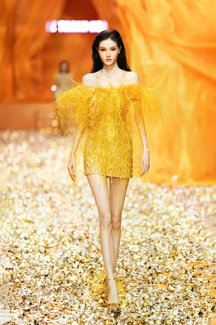Màu vàng gold – biểu tượng của sự thịnh vượng, vinh quang và trường tồn là yếu tố chủ đạo xuyên suốt các thiết kế. Các chi tiết hoa văn, đường nét đặc trưng của phong cách Hòa Lai trong nghệ thuật điêu khắc Champa được khéo léo tái hiện qua nhiều kỹ thuật khác nhau, từ in ấn đến dập nổi, thêu đính... Sàn diễn được đạo diễn Long Kan đầu tư dàn dựng công phu, mang đến ấn tượng đặc biệt với những tiểu cảnh tái hiện không gian kiến trúc Champa cổ