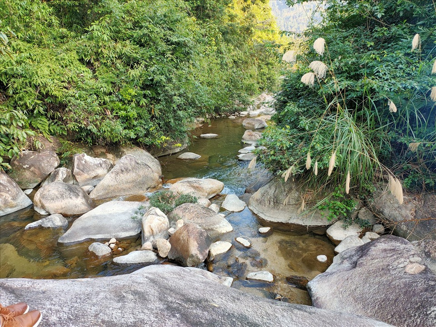 | Bên dưới dòng thác là vô số các hòn đá lơn bị bào mòn, tạo nên những chiếc “ghế tạm” cho du khách ngồi thư thái ngắm cảnh và check in. Ảnh: Q.D |