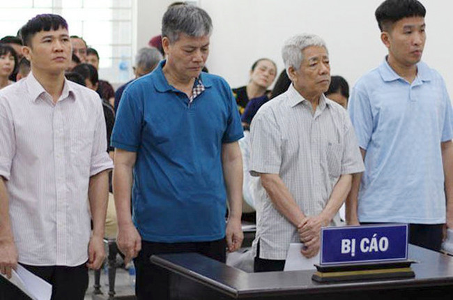 Nguyễn Ngọc Sự và 3 đồng phạm tại phiên sơ thẩm hồi tháng 6/2019. (Ảnh tư liệu)