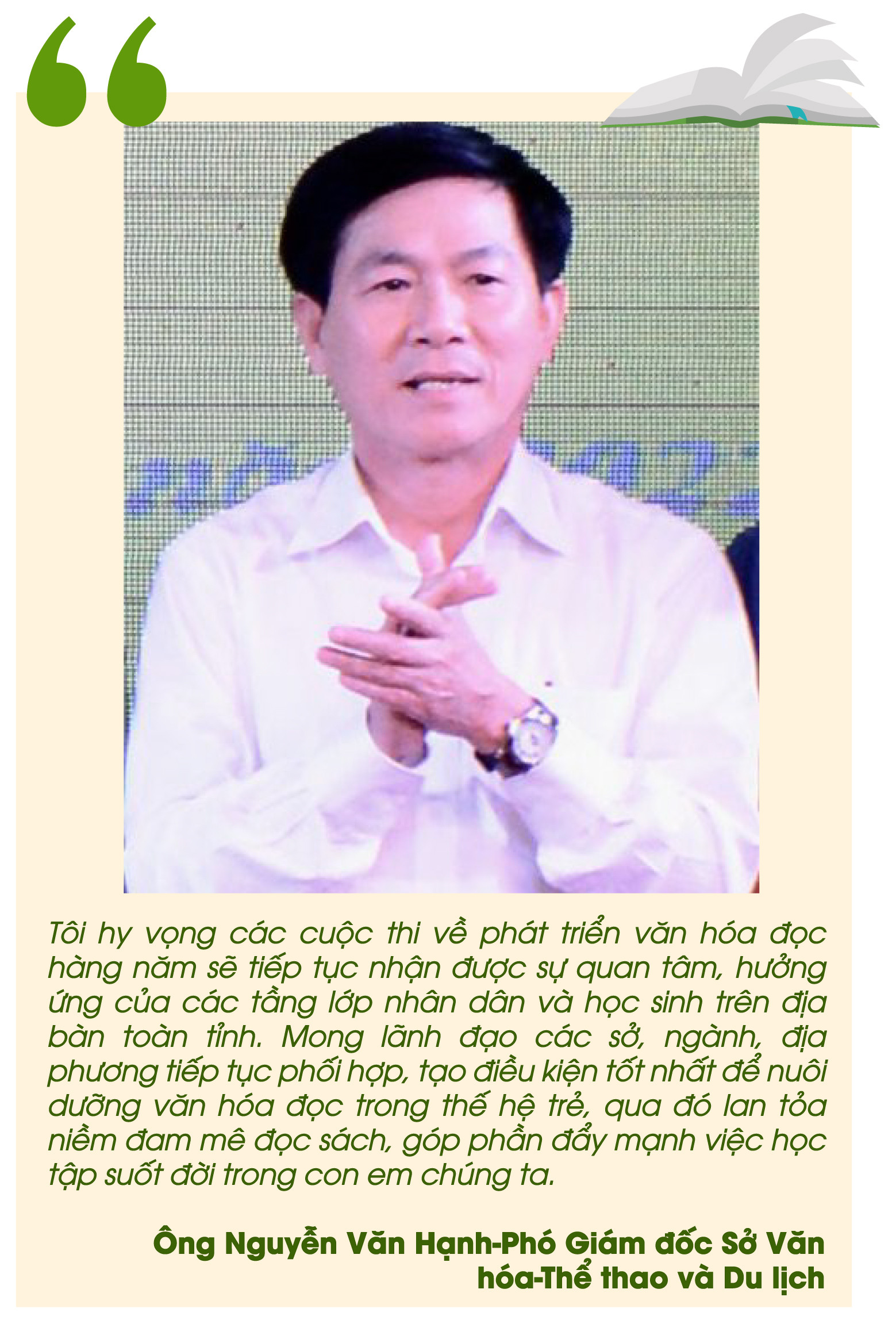 Sau 1 năm ngừng trao giải trực tiếp do ảnh hưởng bởi dịch Covid-19, buổi lễ đã diễn ra với tất cả niềm háo hức, mong chờ của những người tham dự. Với cuộc thi “Giới thiệu sách trực tuyến”, từ 157 video dự thi vòng chung kết cấp tỉnh, Ban tổ chức đã chọn lựa trao giải cho 5 tập thể và 25 cá nhân. Ngoài ra, 15 bài dự thi xuất sắc nhất được Ban tổ chức lựa chọn tham gia cuộc thi cấp toàn quốc. Trong khi đó, cuộc thi “Đại sứ văn hóa đọc” tiếp tục thể hiện sức hút với 29.411 bài tham gia dự thi của học sinh 166 trường học trên địa bàn tỉnh. Bên cạnh tôn vinh 4 tập thể và 72 cá nhân xuất sắc, Ban tổ chức cũng chọn 20 bài dự thi gửi về Bộ Văn hóa-Thể thao và Du lịch để tham gia cuộc thi cấp toàn quốc.