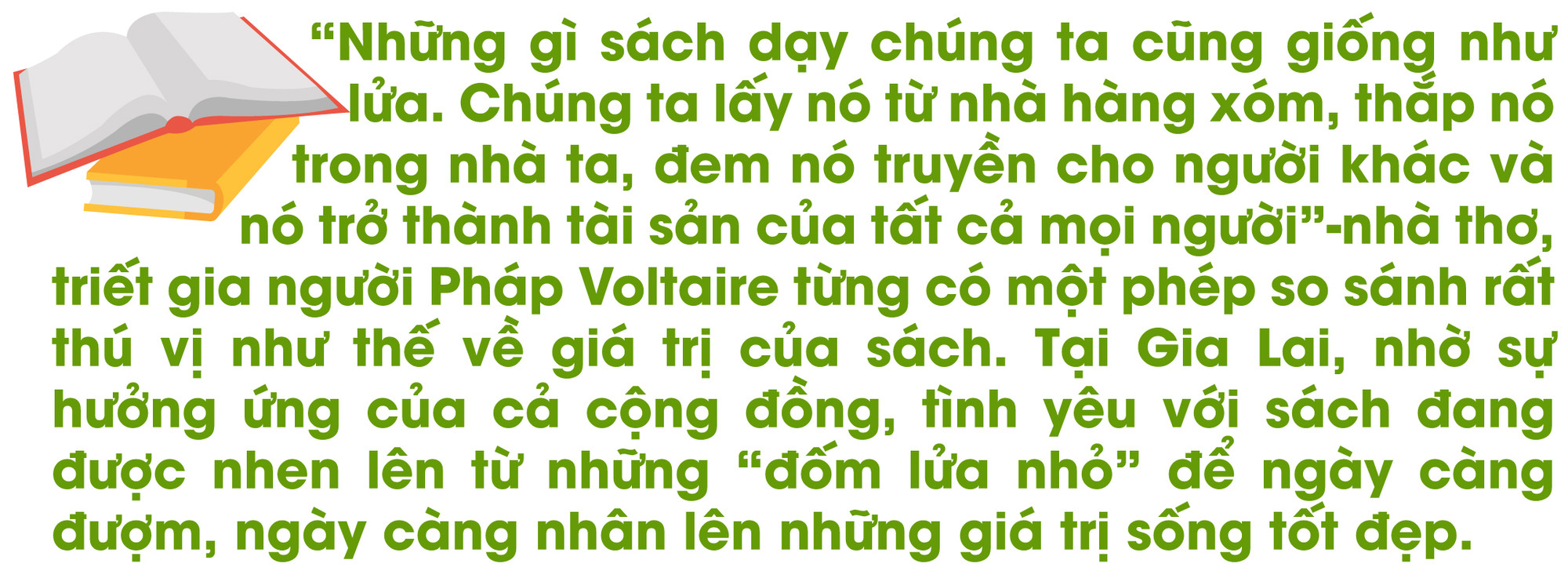 Như mạch nước ngầm, văn hóa đọc đang lan tỏa sâu rộng đến cả vùng sâu, vùng xa. Nhằm khơi dậy tình yêu sách trong đoàn viên, thanh niên, năm 2019, Đoàn xã Ia Tul (huyện Ia Pa) đã vận động các nhà hảo tâm đóng góp để lắp đặt “Tủ sách thanh niên”. Anh Nay Thiên-Bí thư Đoàn xã-thông tin: Từ đó đến nay, tủ sách với hơn 200 đầu sách nhiều thể loại như: pháp luật, khởi nghiệp, gương người tốt-việc tốt, hôn nhân gia đình… đã góp phần giúp các bạn trẻ mở mang kiến thức, trau dồi kỹ năng, bồi dưỡng những giá trị sống tốt đẹp.