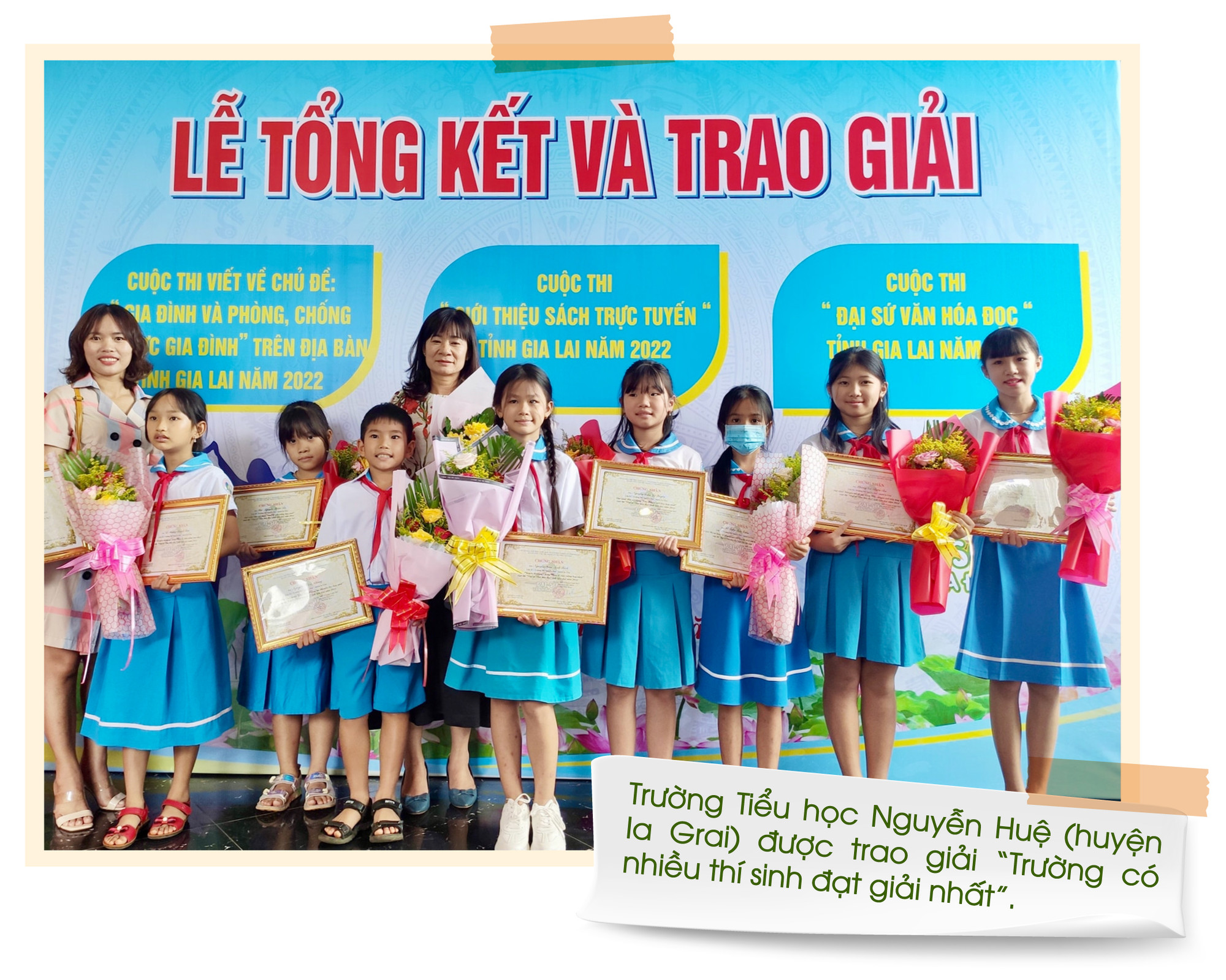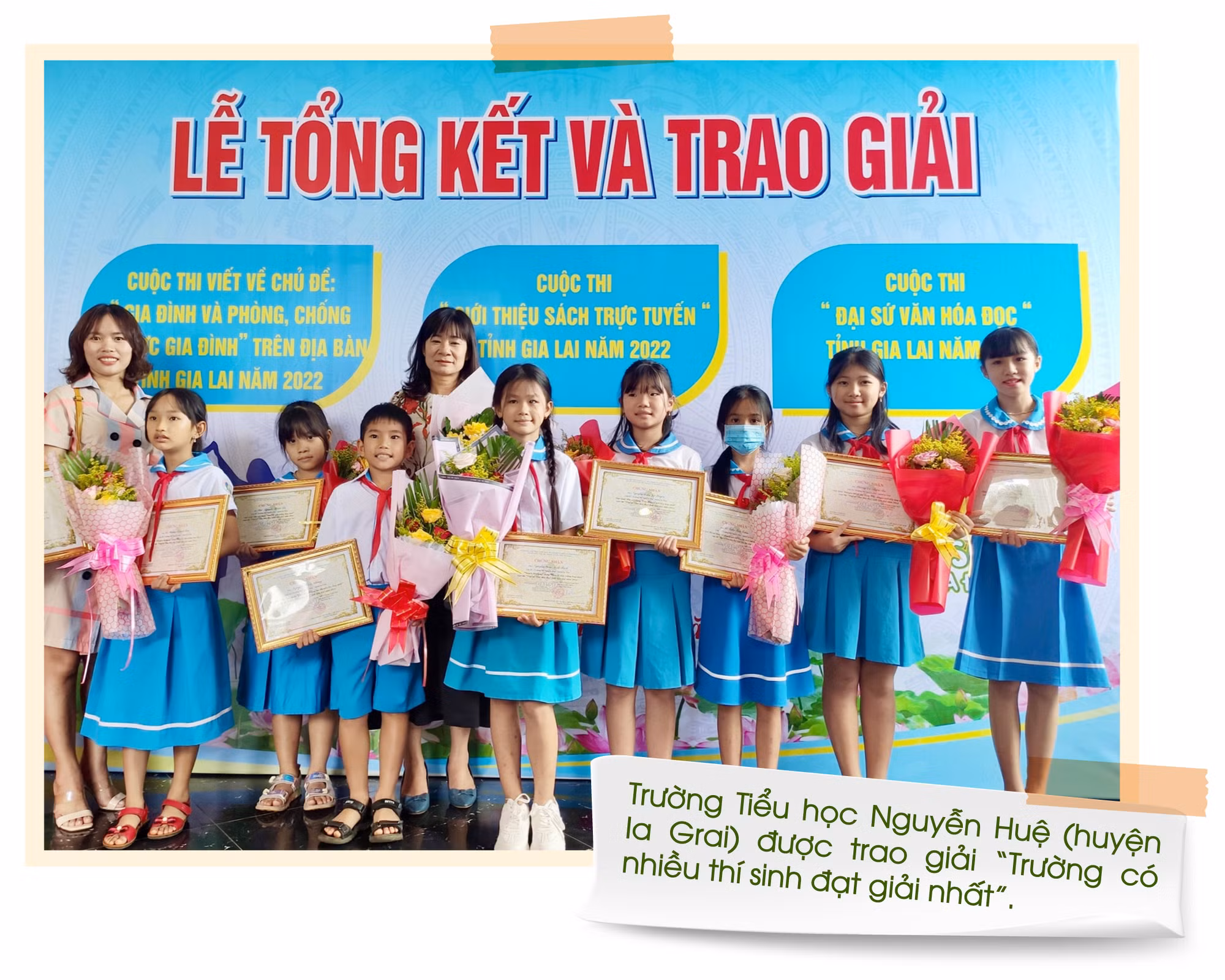 Mặt khác, hàng năm, khi cuộc thi “Đại sứ văn hóa đọc” được phát động, đa số các trường đều hưởng ứng nhiệt tình. Tại cuộc thi năm 2022, Trường Tiểu học Nguyễn Huệ (huyện Ia Grai) đã vinh dự được trao giải “Trường có nhiều thí sinh đạt giải nhất”. Trong số 10 giải mà học sinh nhà trường “gặt hái” được có 2 giải nhất, 3 giải nhì, 1 giải ba và 4 giải khuyến khích. Niềm tự hào càng nhân lên khi trường có 3/20 bài thi được chọn tham gia cuộc thi cấp toàn quốc. Qua câu chuyện với cô Đinh Thị Dua-Hiệu trưởng nhà trường, có thể thấy đây là kết quả của một quá trình đầu tư lâu dài, có chiều sâu. Cô Dua cho hay, để gieo niềm hứng thú đọc sách cho học sinh, nhà trường chú trọng đầu tư cho hệ thống thư viện, từ thư viện di động ở từng lớp, thư viện cầu thang, thư viện xanh ở sân trường đến thư viện chính. Ngoài vận động đóng góp để làm phong phú các thể loại, đầu sách, nhà trường còn thường xuyên luân chuyển sách giữa các lớp, các khối. “Tới đây, trong lễ khai giảng năm học mới, nhà trường sẽ biểu dương, khen thưởng các em đạt giải tại cuộc thi cũng như những giáo viên tâm huyết với sách”-cô Dua chia sẻ.