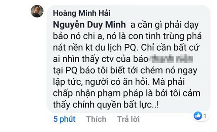 Trao đổi với Zing.vn, ông Hoàng Minh Hải, chủ quán phở Hồng Anh ở thị trấn Dương Đông, xác nhận việc đăng Facebook với nội dung "giận dữ" khi báo chí liên tục đăng tin, bài phản ánh chuyện ngập nước ở Phú Quốc. Theo ông Hải, đảo ngọc có nhiều chuyện để viết, thầy Trung thường xuyên đưa tin về chuyện ngập sẽ gây ảnh hưởng đến các doanh nghiệp đang đầu tư vào đảo ngọc.