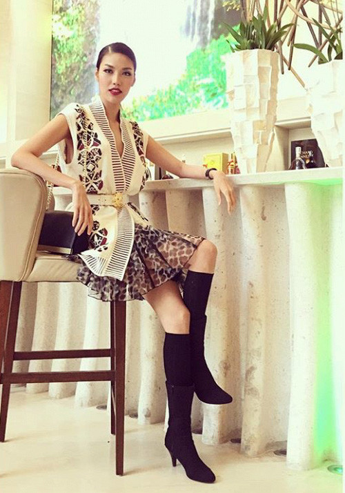 Nếu boots chưa đủ cao, bạn hãy học Lan Khuê đi thêm một đôi tất để nâng tầm thêm cho trang phục.