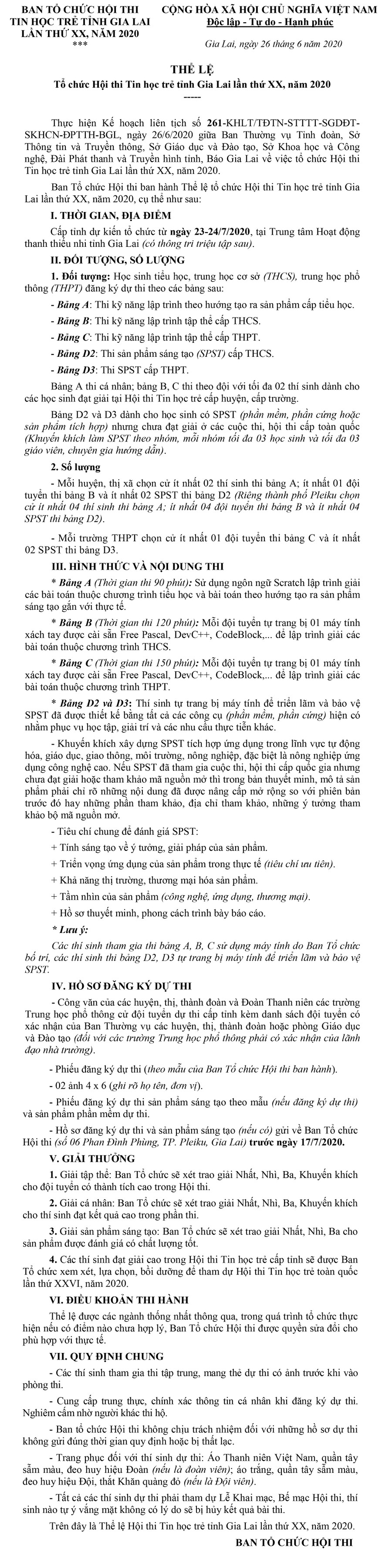 (GLO)- Thực hiện Kế hoạch liên tịch số 261-KHLT/TĐTN-STTTT-SGDĐT-SKHCN-ĐPTTH-BGL, ngày 26/6/2020 giữa Ban Thường vụ Tỉnh đoàn, Sở Thông tin và Truyền thông, Sở Giáo dục và Đào tạo, Sở Khoa học và Công nghệ, Đài Phát thanh và Truyền hình tỉnh, Báo Gia Lai về việc tổ chức Hội thi Tin học trẻ tỉnh Gia Lai lần thứ XX, năm 2020. Ban Tổ chức Hội thi ban hành Thể lệ tổ chức Hội thi Tin học trẻ tỉnh Gia Lai lần thứ XX, năm 2020, cụ thể như sau: