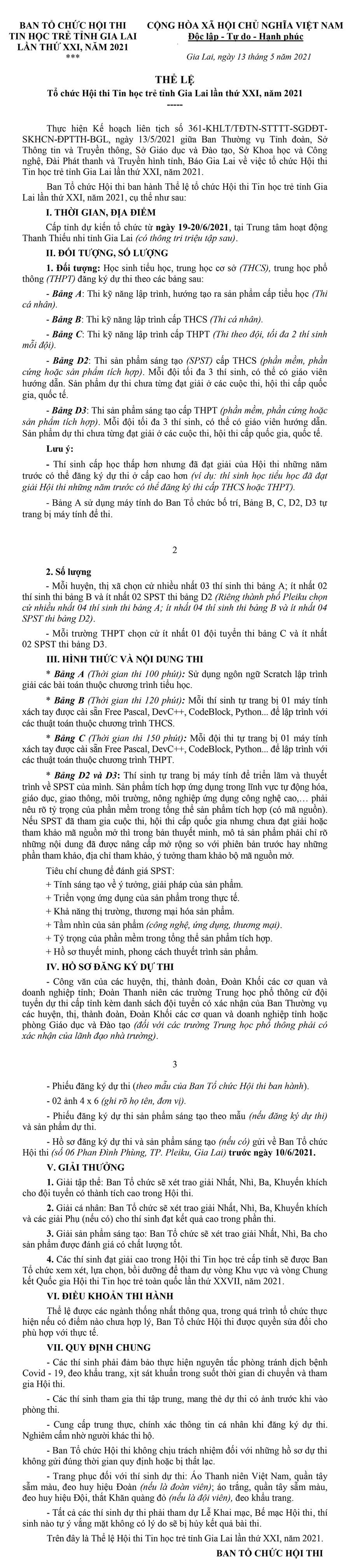 (GLO)- Ngày 13-5, Ban tổ chức Hội thi Tin học trẻ tỉnh Gia Lai lần thứ XXI, năm 2021 đã ban hành Thể lệ tổ chức hội thi.