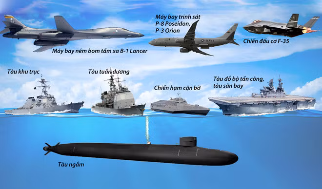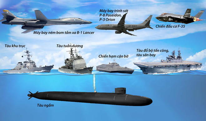 Mỹ đang triển khai lực lượng tàu chiến và máy bay đa dạng ở Biển Đông và khu vực xung quanh. ĐỒ HỌA: HOÀNG ĐÌNH